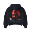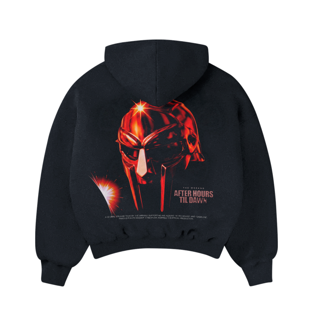 Hoodie con capucha de algodón premium con ajuste estructurado. Destaca por un gráfico en alta definición estampado en la espalda de una brillante máscara metálica roja, complementado con tipografía minimalista del tour en la parte inferior. Acabado frontal limpio y elegante.