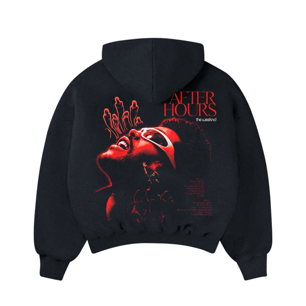 Hoodie con capucha de algodón premium calidad luxury con caída estructurada. En la espalda, luce un impresionante gráfico de un reloj digital metálico con el sello de ANM Studio, fuertemente resaltado por el aura roja de la tipografía “HURRY UP TOMORROW” y un cuidado bloque de texto en la zona inferior. Acabado frontal limpio y elegante.