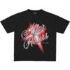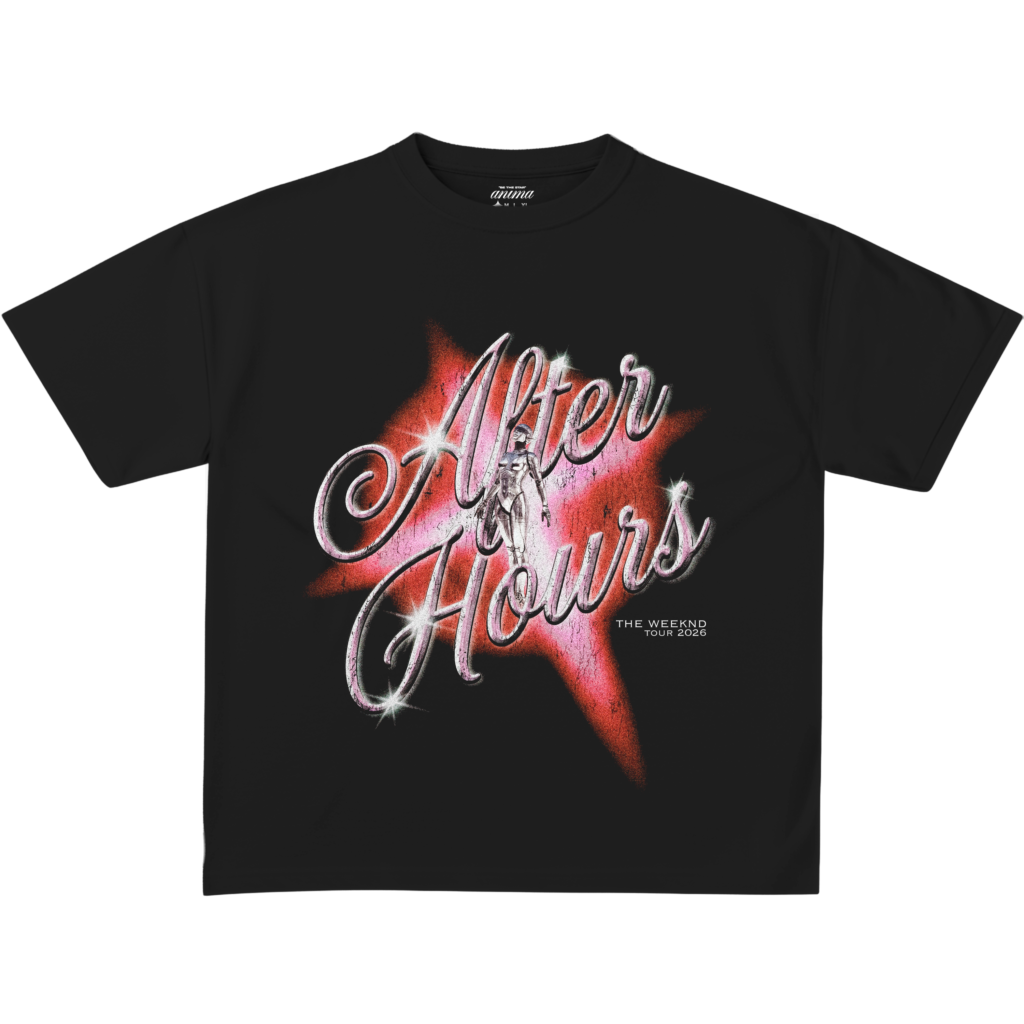 Camiseta de manga corta de algodón premium con corte a medida y cuello acanalado. Destaca por su gráfico central estampado, el cual contrasta la tipografía retro de “After Hours” en tonos cromados sobre un destello rojo vibrante y una silueta robótica. Espalda de líneas limpias.