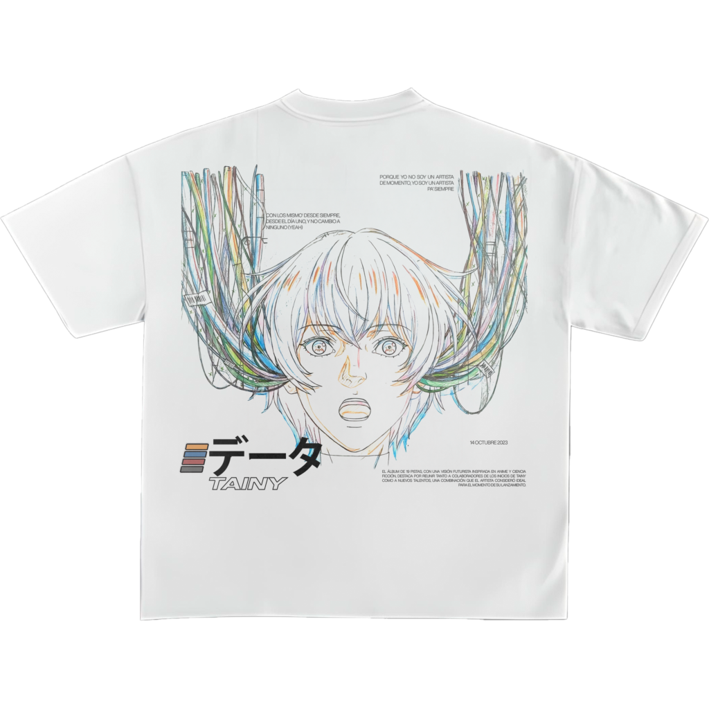 Custom-fit cotton tee. Camiseta de manga corta con cuello redondo reforzado. Presenta artes gráficos exclusivos de la era “DATA” de Tainy, fusionando elementos de cibernética y arte lineal japonés. Una prenda esencial que combina la seriedad del diseño editorial con la energía del género urbano.