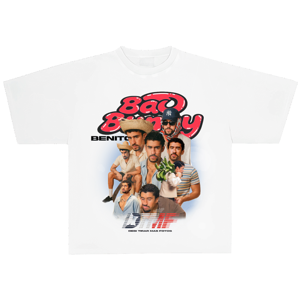 Una celebración visual a la esencia multifacética de Benito. Este diseño en collage rinde homenaje a sus múltiples versiones: desde el campesino nostálgico con sombrero hasta el ícono urbano con gafas y cadenas. Una mezcla entre ternura caribeña y poder latino, inmortalizando la era DTMF (Debí Traer Más Fotos) como si fuera una portada vintage de revista pop.