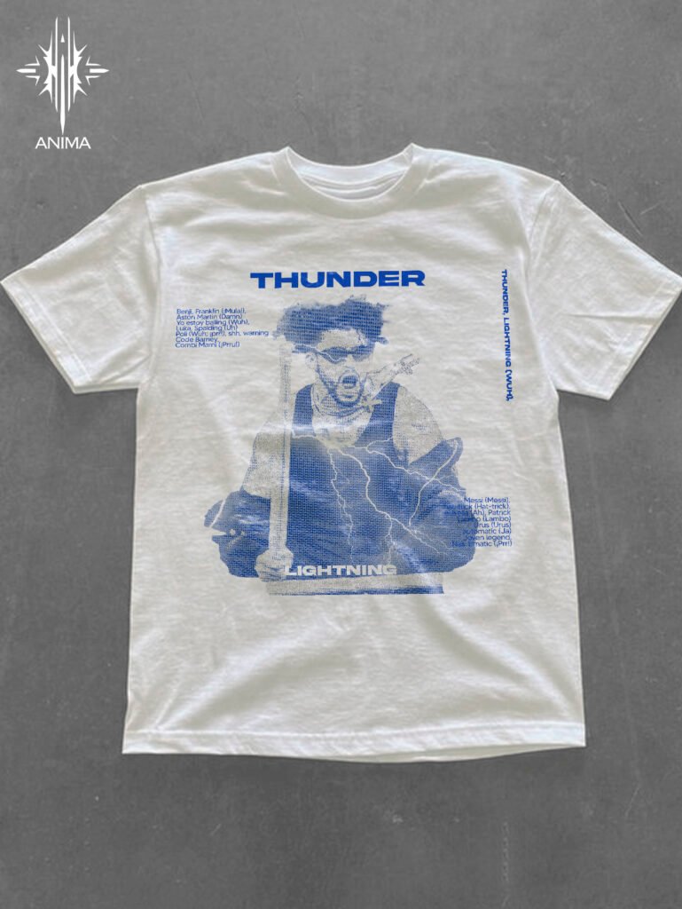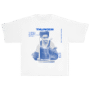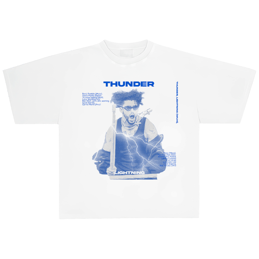Gráfico frontal en azul eléctrico con retrato de Bad Bunny. Estética tipo póster con relámpagos y tipografía bold. Detalles gráficos en estilo técnico y listado textual tipo credits. Cuello acanalado, parte trasera limpia.