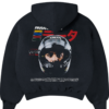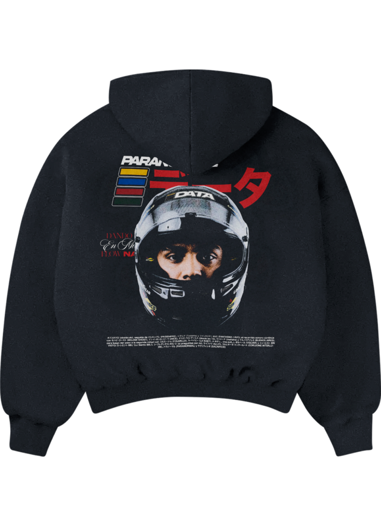 Heavyweight cotton fleece hoodie en “Solid Black”. Esta sudadera de corte custom fit presenta una impresión central fotorrealista de alta definición en el pecho. El diseño rinde homenaje a PARANORMAL de “DATA” con casco técnico y detalles tipográficos de estilo Nascar. Incluye capucha estructurada y puños de rib grueso, equilibrando la energía urbana con la sofisticación del diseño editorial de alta gama.