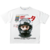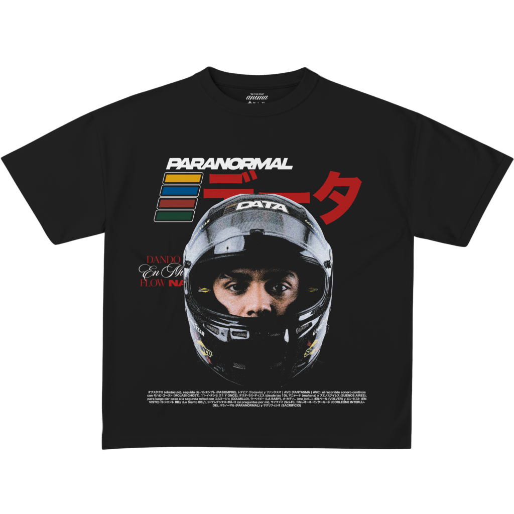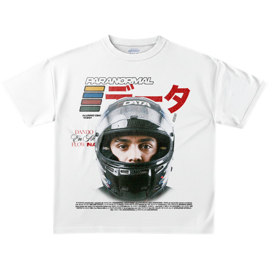 Custom-fit vintage white cotton short sleeve tee. Esta camiseta de alto gramaje presenta un cuello acanalado de alta densidad y un gráfico central fotorrealista. El diseño rinde homenaje al piloto y artista Álvaro Díaz en el universo “Paranormal”, utilizando una estética de racing retro y cyberpunk. Una prenda con un corte estructurado que redefine el merch artístico contemporáneo