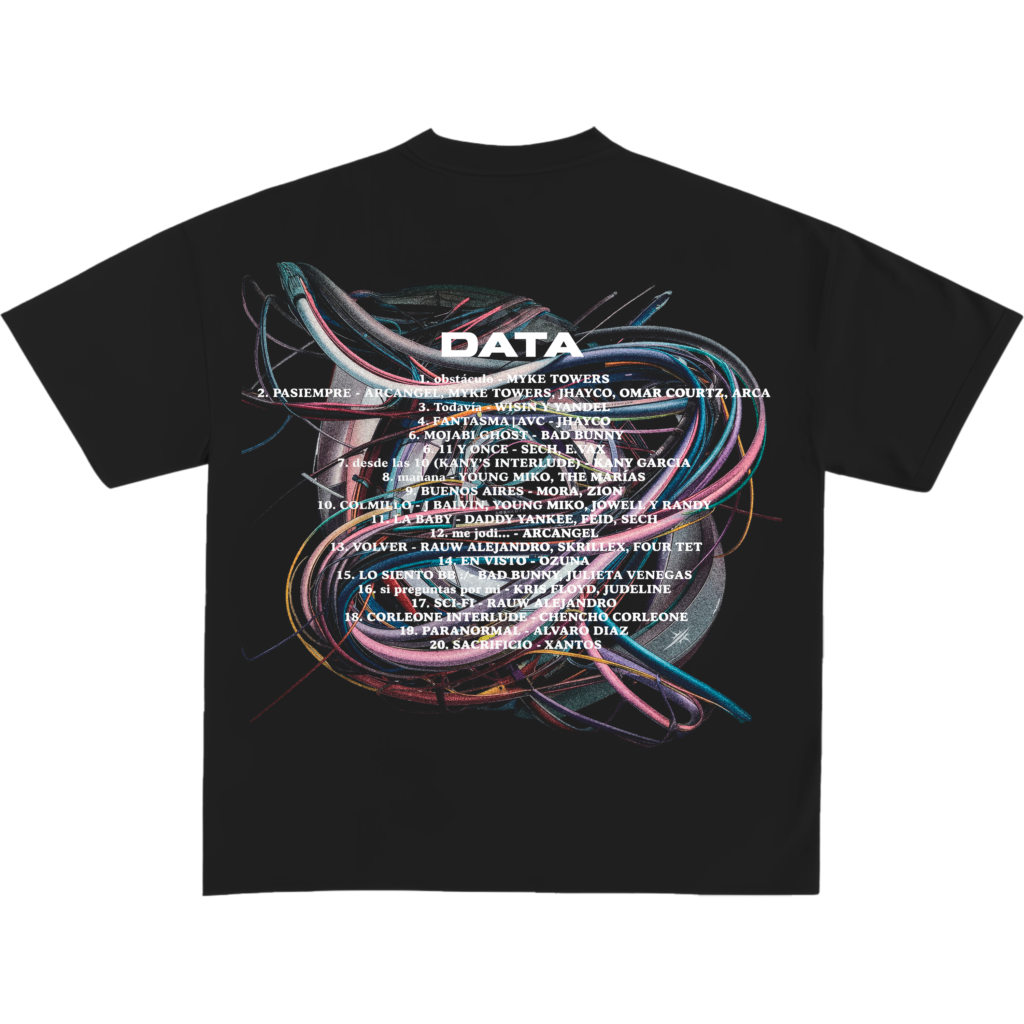 Graphic T-shirt de corte Boxy. Confeccionada en algodón premium, esta pieza destaca por su ilustración frontal detallada y tipografía técnica en la base. El gráfico captura la esencia de la transferencia de emociones y memorias humanas, concepto eje del álbum “DATA”. El ajuste estructurado y el acabado de la impresión garantizan una durabilidad excepcional y una estética de lujo.
