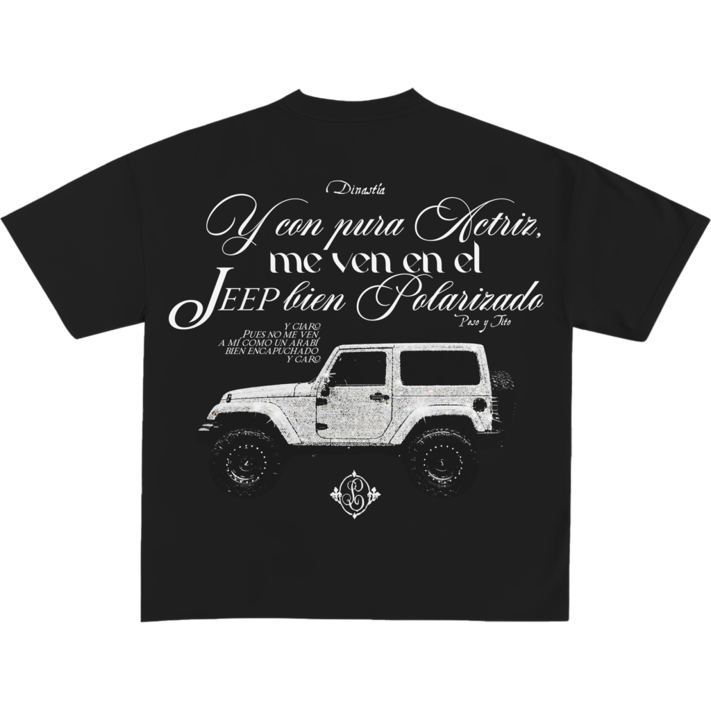 Camiseta negra oversized en algodón premium 260 GSM. Estampado DTF en blanco alto contraste con tipografía ornamental protagonista.