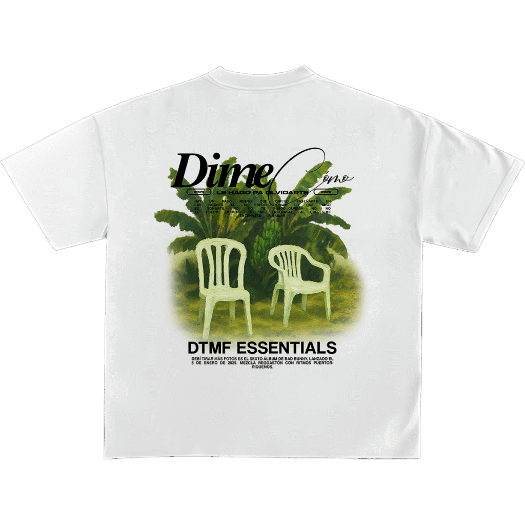 Una postal nostálgica inspirada en el imaginario visual del álbum “Nadie Sabe Lo Que Va a Pasar Mañana” de Bad Bunny. Las sillas blancas de plástico entre hojas de plátano evocan la calidez del barrio, los recuerdos y la melancolía. Esta pieza forma parte de la colección DTMF Essentials, un tributo gráfico al sonido y esencia del reguetón puertorriqueño contemporáneo.