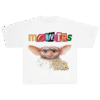 La icónica ternura de Gizmo, el Mogwai más famoso del cine, queda inmortalizada en esta playera blanca de corte relajado. El personaje aparece con su clásica mirada dulce y peluda, acompañado del texto “FUR REAL TROUBLE” en tipografía estilo punk en llamas.
