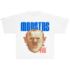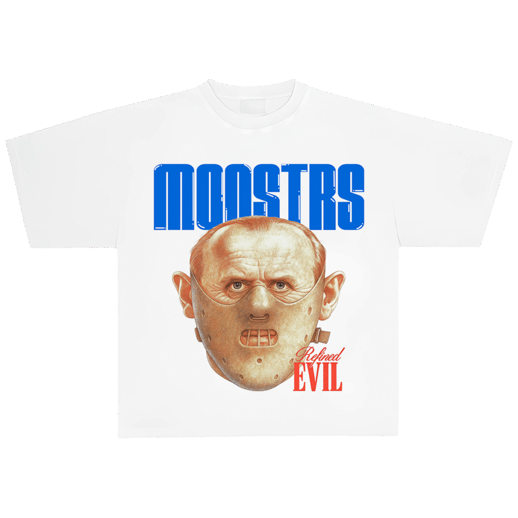 El mal más sofisticado toma forma en esta playera blanca con una ilustración detallada del infame Hannibal Lecter, con su clásica máscara de contención y una mirada tan fría como brillante. Encima, el título “MONSTRS” en tipografía azul sólida, y debajo el sello: Refined Evil.