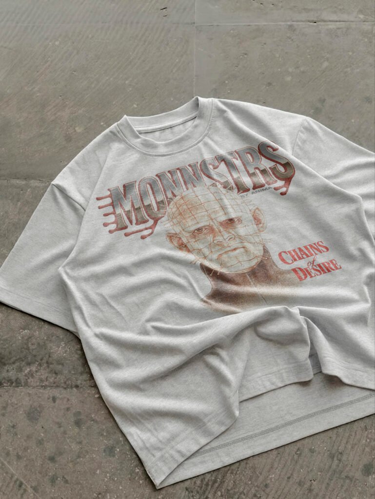 La palabra MONNSTRS gotea como sangre espesa en una tipografía que mezcla lo retro con lo grotesco. Acompañado por el lema “Chains of Desire” en rojo intenso, que encapsula el delirio entre dolor y placer.