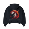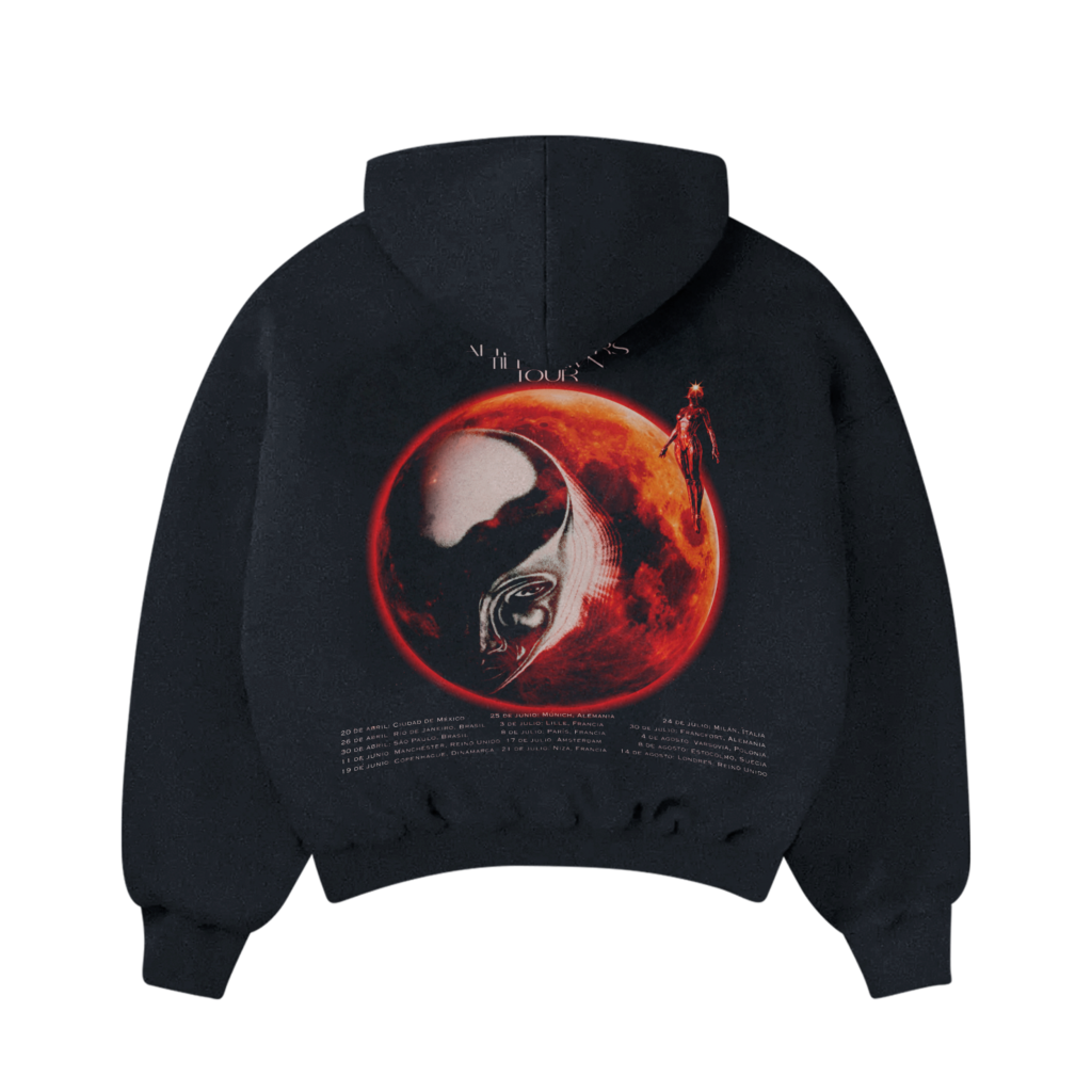 Hoodie con capucha de algodón premium de alto gramaje y silueta estructurada. Presenta un imponente gráfico estampado en la espalda protagonizado por un rostro cromado fusionado con una luna roja, acompañado por las fechas y la tipografía oficial del tour. Frente de diseño limpio y minimalista.