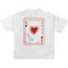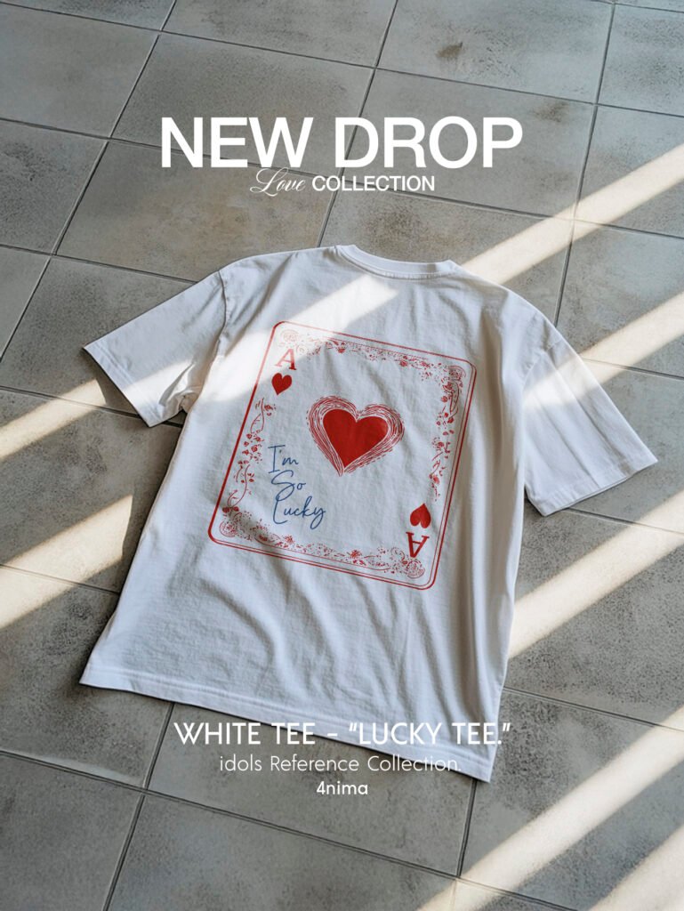 Gráfico trasero en formato de carta de corazones, con ilustración central de corazón rojo dibujado a mano. Detalles ornamentales en rojo y tipografía manuscrita azul con la frase “I’m so lucky”. Una prenda que juega entre la suerte, el amor y lo inesperado. Ideal para quienes apuestan todo al sentimiento.