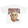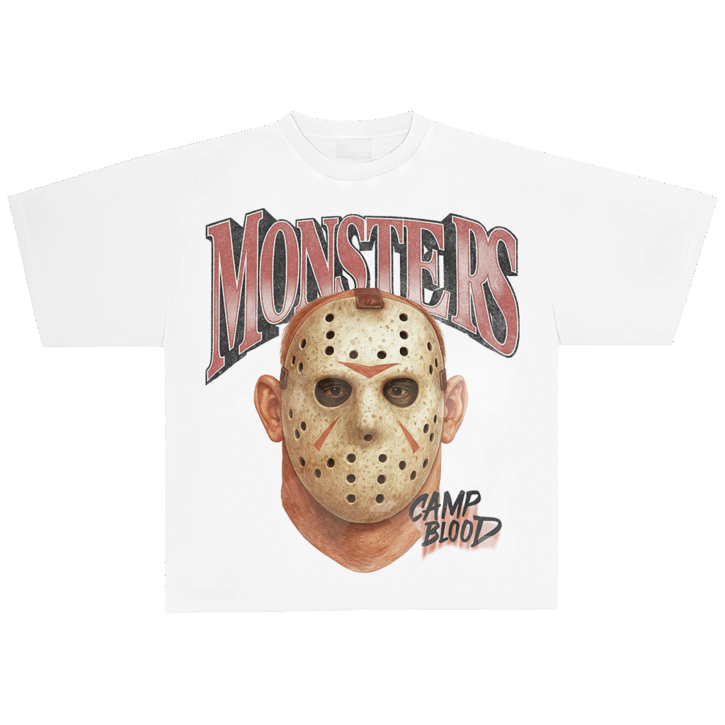 El terror de Crystal Lake llega en forma de arte gráfico. Esta playera blanca rinde homenaje al ícono del slasher Jason Voorhees, con una ilustración realista de su icónica máscara de hockey, acompañada por el texto “MONSTERS” en gran formato y el sello “CAMP BLOOD” en tipografía estilo retro punk.