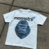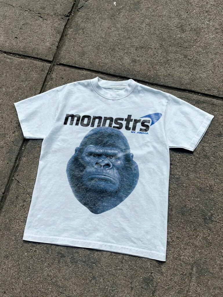 Una declaración de poder en forma de retrato. Esta playera presenta el imponente rostro de un gorila gigante, con textura hiperrealista y tonos azulados que realzan su fuerza y solemnidad. Sobre él, el logo monnstrs by ANIMA evoca una estética futurista inspirada en la exploración espacial y la cultura pop noventera.