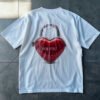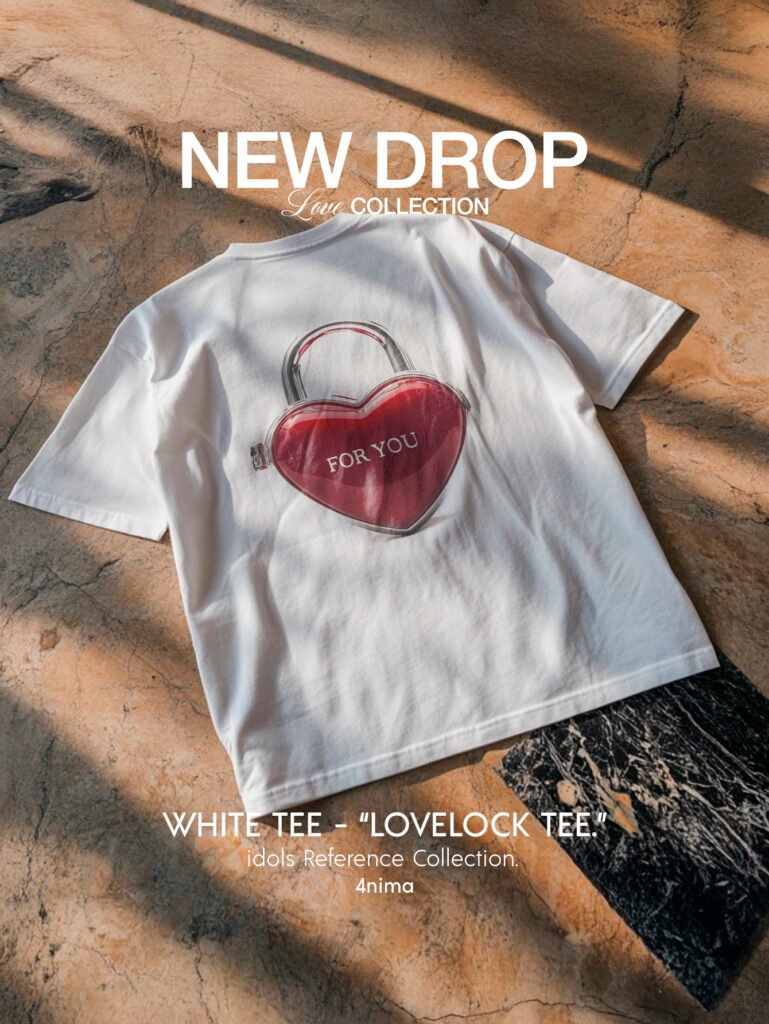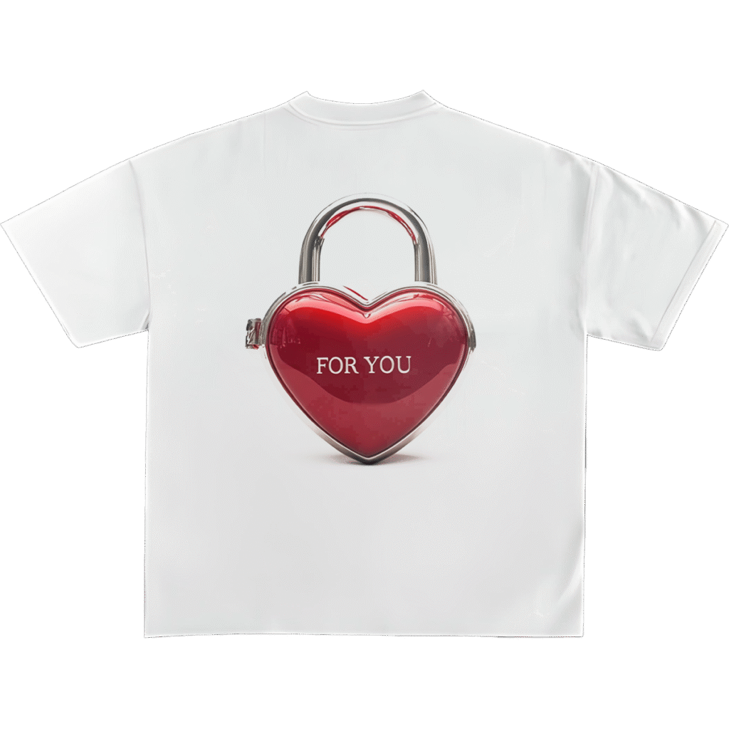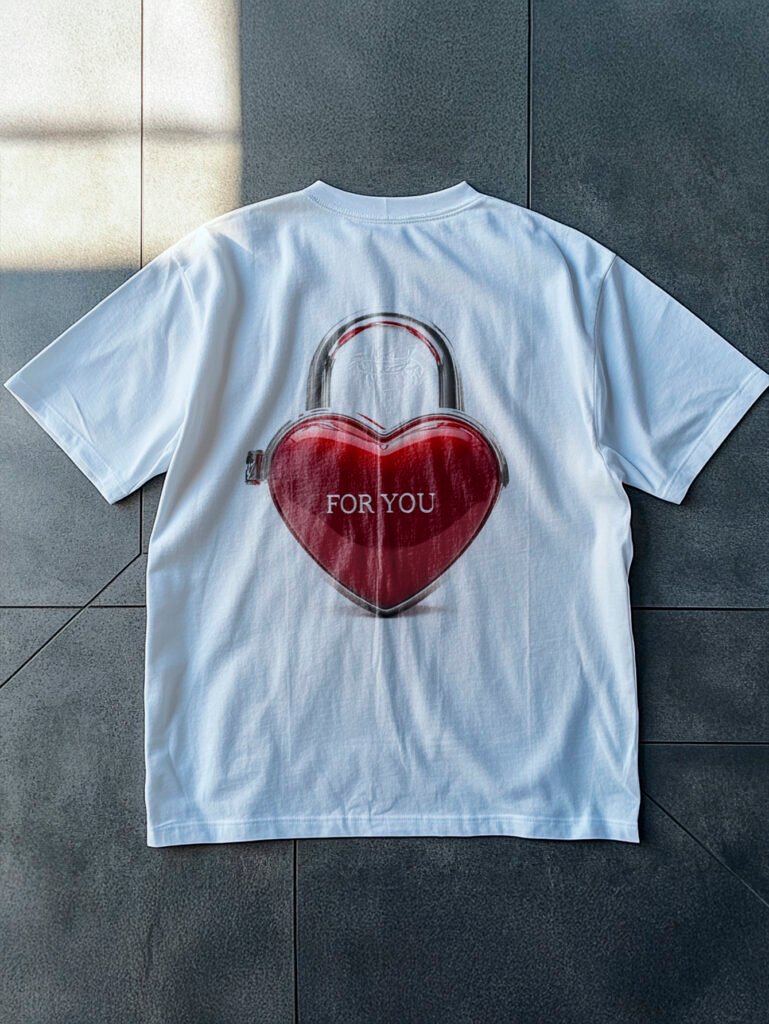 Gráfico trasero con candado en forma de corazón rojo brillante y la frase central “FOR YOU”. Diseño limpio, concepto directo: una pieza que simboliza pertenencia, deseo y entrega. Parte frontal sin estampado y cuello acanalado clásico.