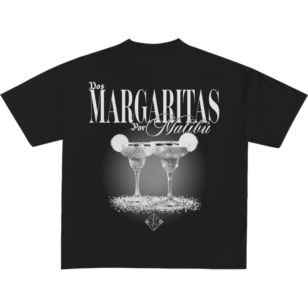 Camiseta negra oversized en algodón premium 260 GSM. Estampado DTF monocromático con brillo sutil y tipografía clásica protagonista.