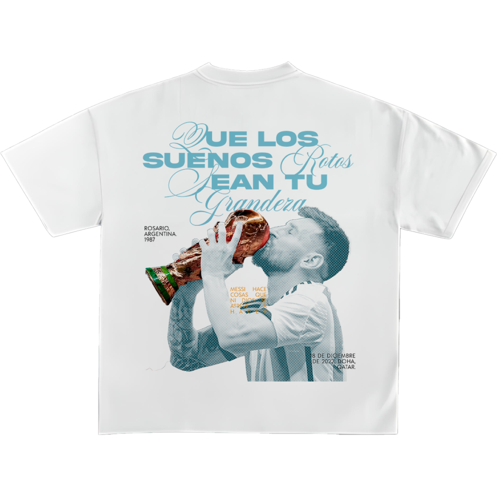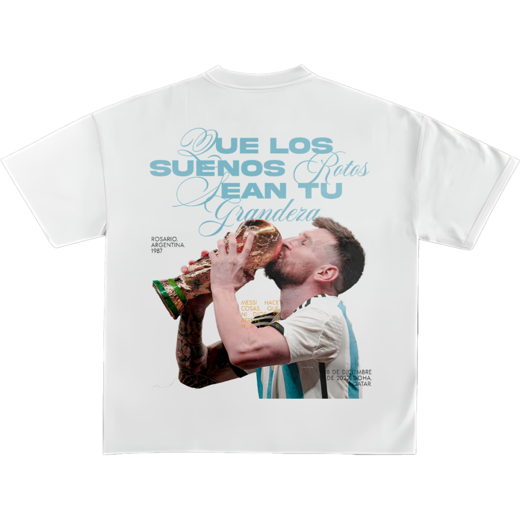 Nuestra playera conmemorativa de Messi celebra su victoria en la Copa del Mundo 2022 en Qatar. Fabricada con ultra heavy cotton, esta tee oversize garantiza durabilidad y comodidad inigualable.