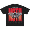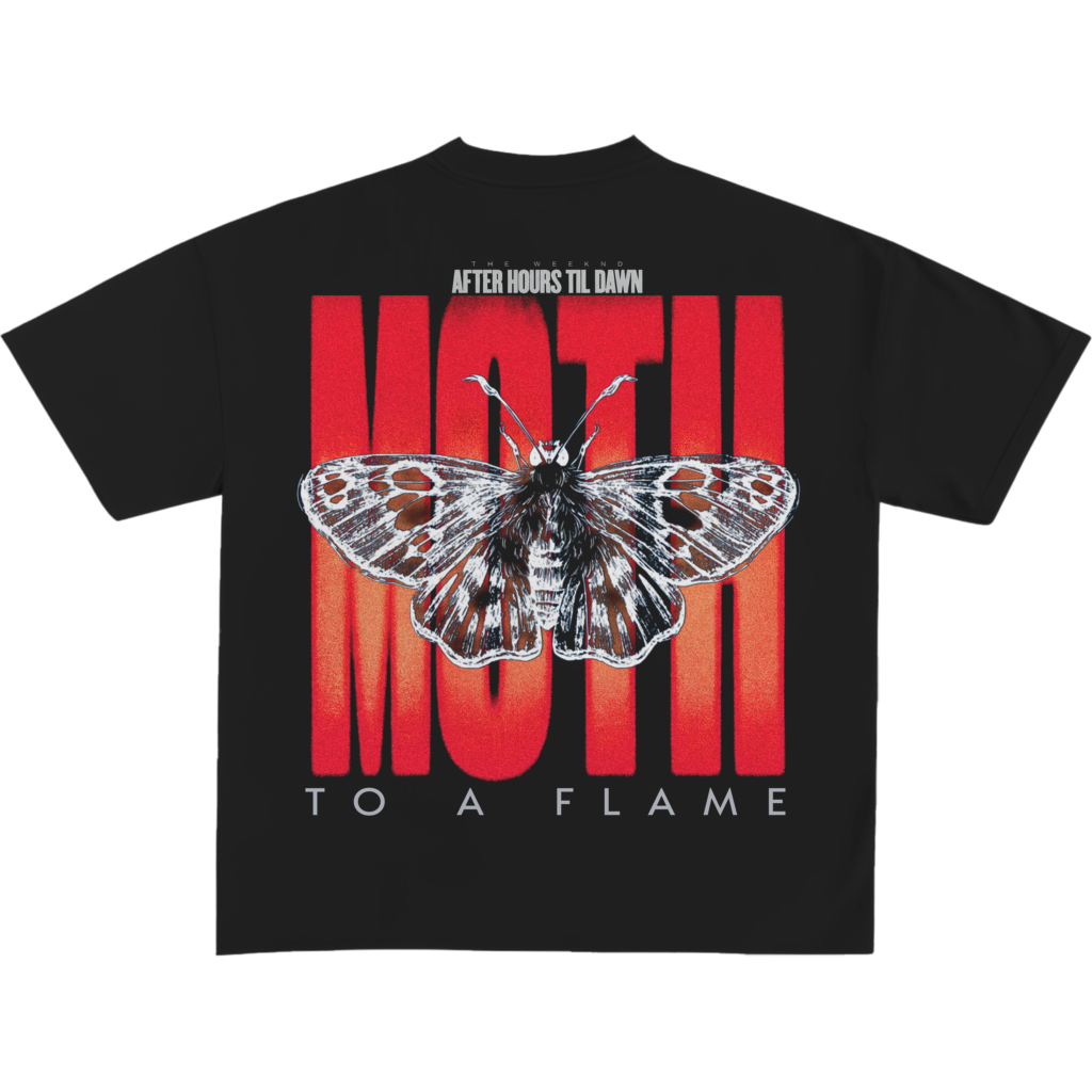 Camiseta de manga corta de algodón premium con corte a medida y cuello acanalado. En la espalda, presenta un gráfico que contrasta una detallada ilustración en blanco y negro de una polilla superpuesta a la audaz tipografía roja en bloque de “MOTH”, rematada con sutiles textos del tour. Frente de diseño limpio.
