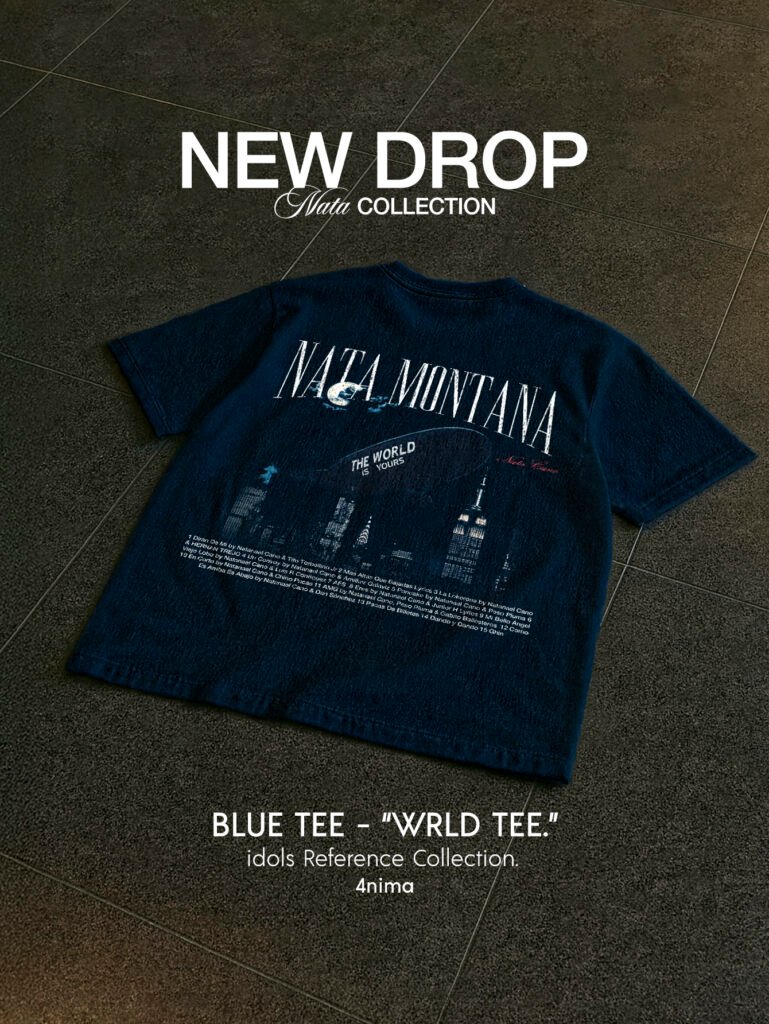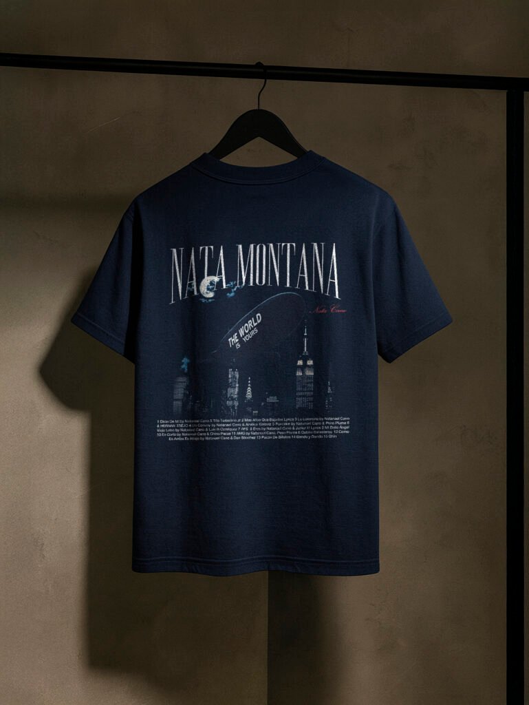 Inspirada en la icónica frase “The World Is Yours”, esta camiseta combina el skyline nocturno con el título del álbum Nata Montana en una composición cinematográfica.