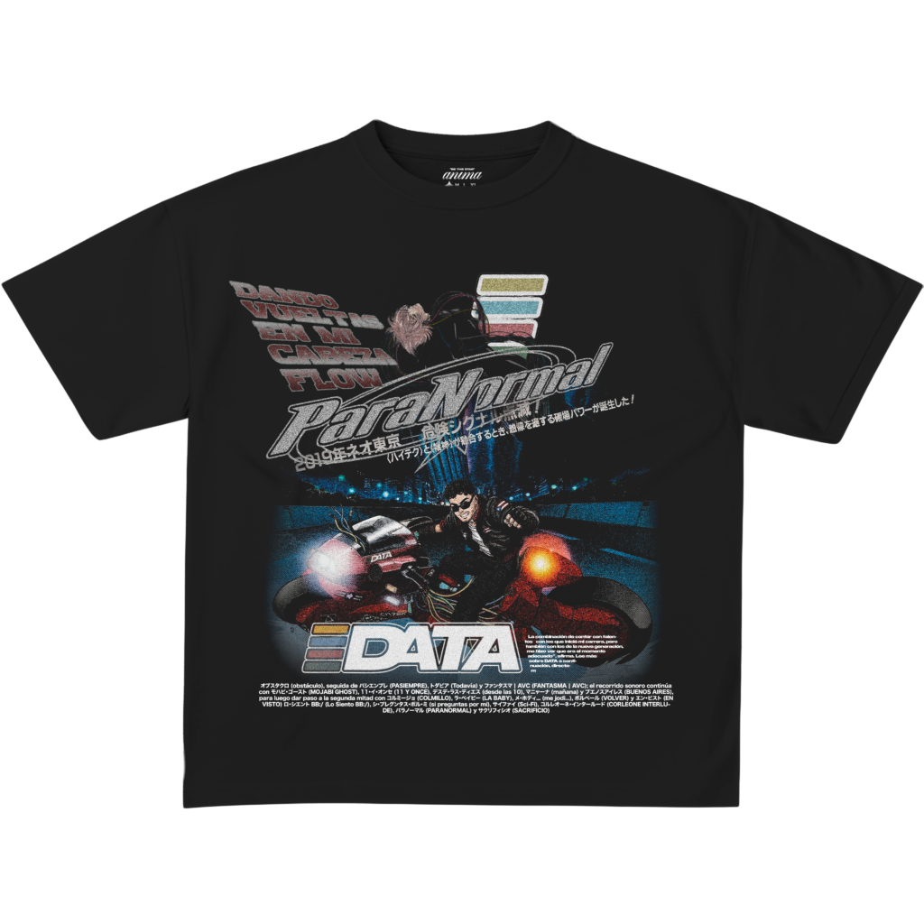 Custom-fit “Paranormal” Graphic Tee. Camiseta de manga corta con silueta estructurada. Presenta gráficos co-brand de Tainy “DATA” con estética retro-anime impresos en el pecho. Cuello acanalado reforzado y construcción de alto gramaje. Un tributo visual a la intersección entre el reggaetón experimental y la ciencia ficción clásica.