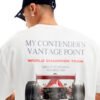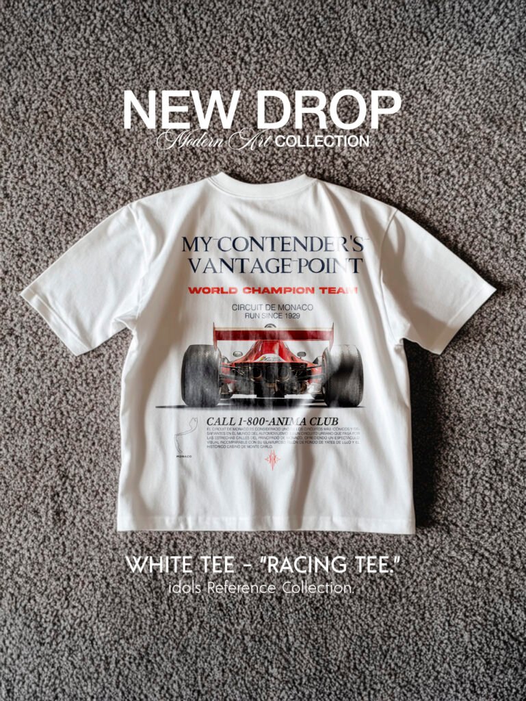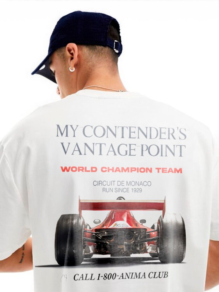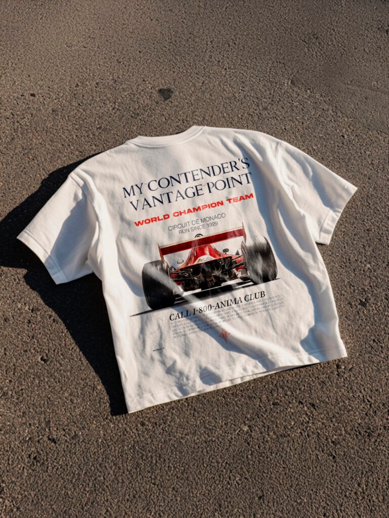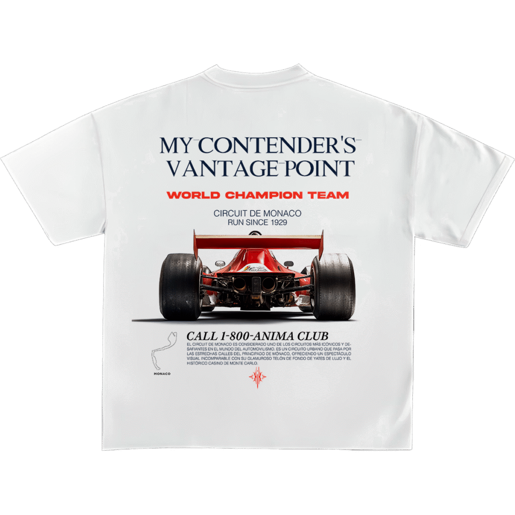 Gráfico trasero con monoplaza clásico de Fórmula 1 visto desde la perspectiva del rival. Tipografías racing y bloque editorial con referencias al icónico circuito de Mónaco. Diseño inspirado en la historia del automovilismo y la obsesión por la victoria. Parte frontal limpia, cuello acanalado.