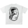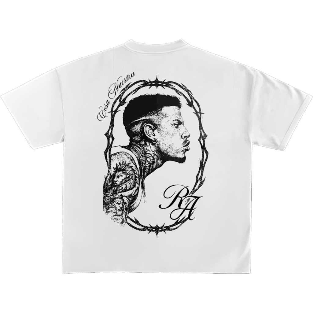 Una pieza que evoca lo icónico desde la sobriedad. Con una ilustración tipo grabado de Rauw Alejandro en perfil, rodeado por un marco de espinas y detalles tipográficos clásicos, esta camiseta mezcla lo sagrado, lo urbano y lo eterno.