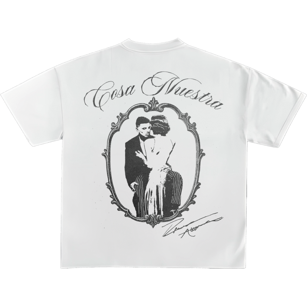 Inspirada en la estética vintage del cine romántico y en la era Cosa Nuestra de Rauw Alejandro, esta pieza captura un momento íntimo enmarcado en elegancia atemporal. El contraste en blanco y negro, junto con la firma de Rauw, la convierten en una declaración visual de pasión y nostalgia.