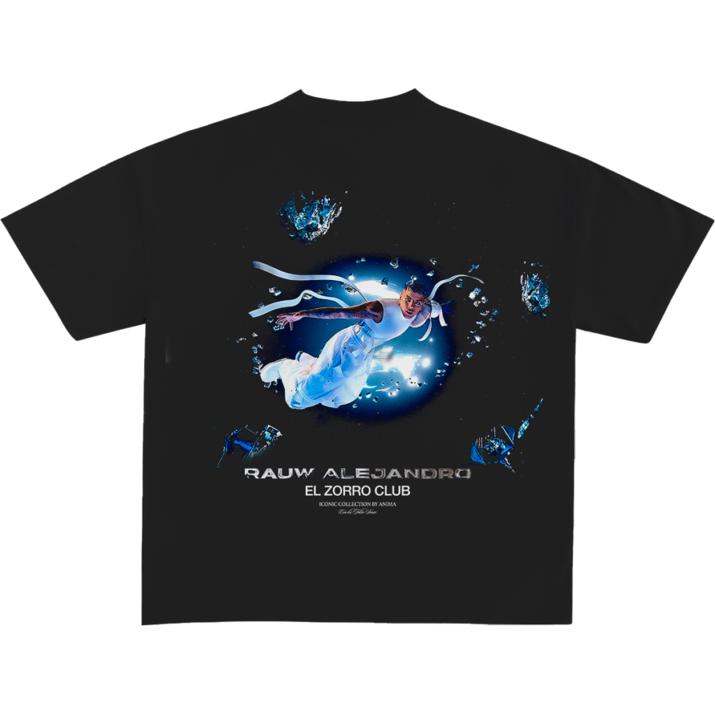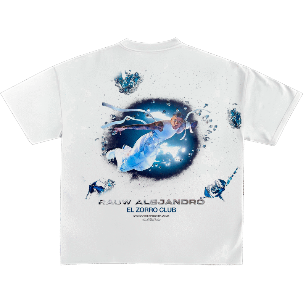 Una edición especial que forma parte de la colección inspirada en Saturno, esta camiseta presenta a Rauw Alejandro en una versión etérea, flotando en una explosión cósmica llena de fragmentos galácticos y energía azul. Con el sello de El Zorro Club, esta prenda rinde homenaje a la estética espacial, sensual y futurista del artista.