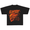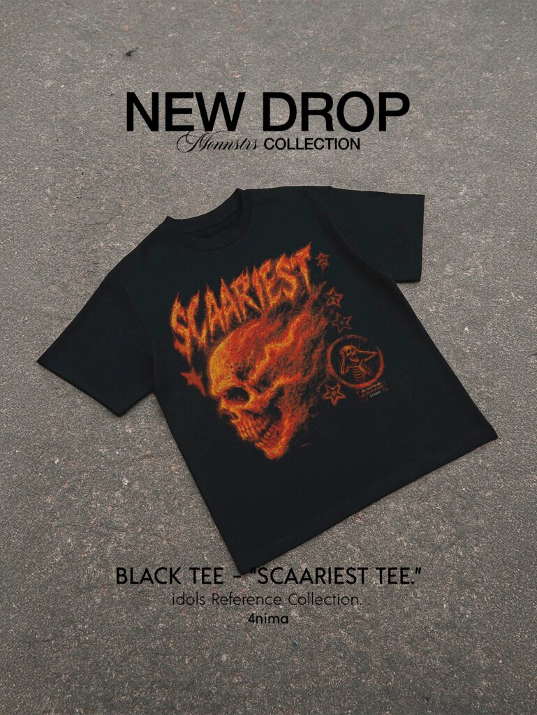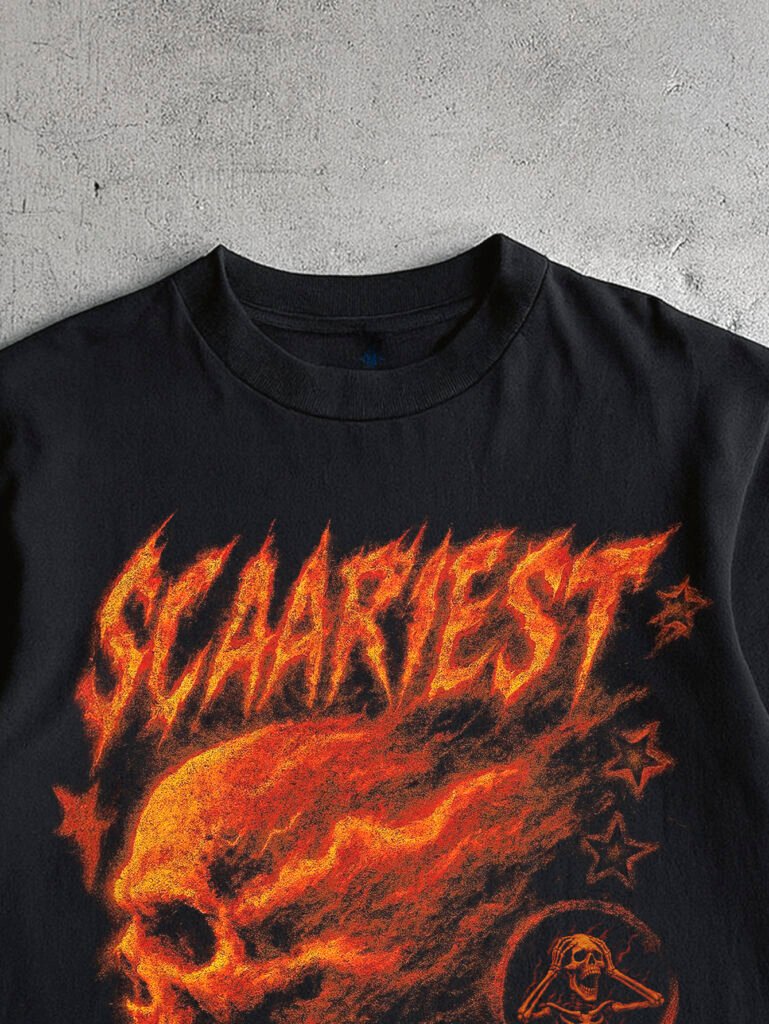 El texto SCARIEST domina el diseño con una tipografía brutal y rasgada, evocando el cine de horror, las portadas de metal noventero y el caos gráfico de los fanzines underground.
