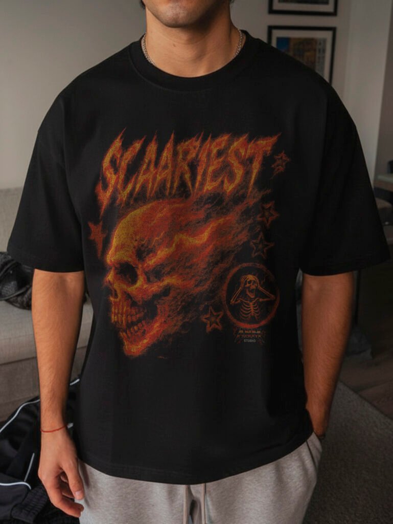 Una explosión de fuego, muerte y estilo. Esta pieza presenta un cráneo en llamas con trazos intensos en tonos rojos y naranjas, acompañado de estrellas ardientes y un esqueleto cubriéndose los ojos, en un gesto icónico de espanto.