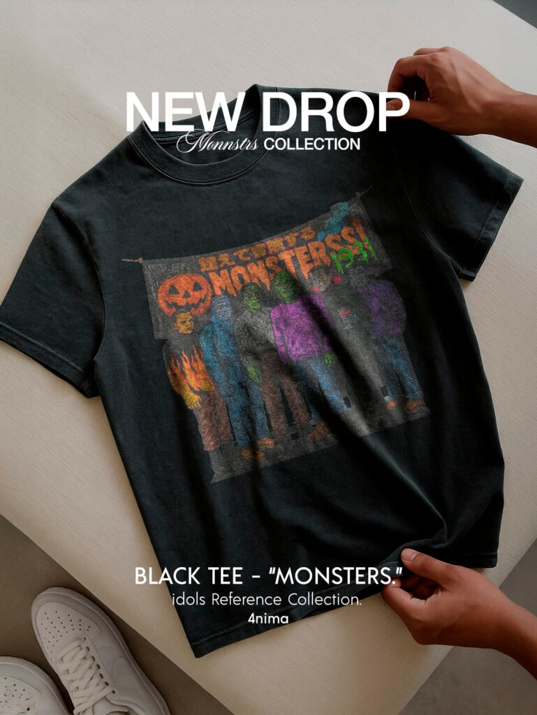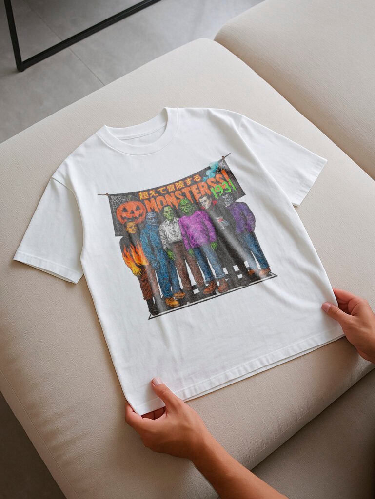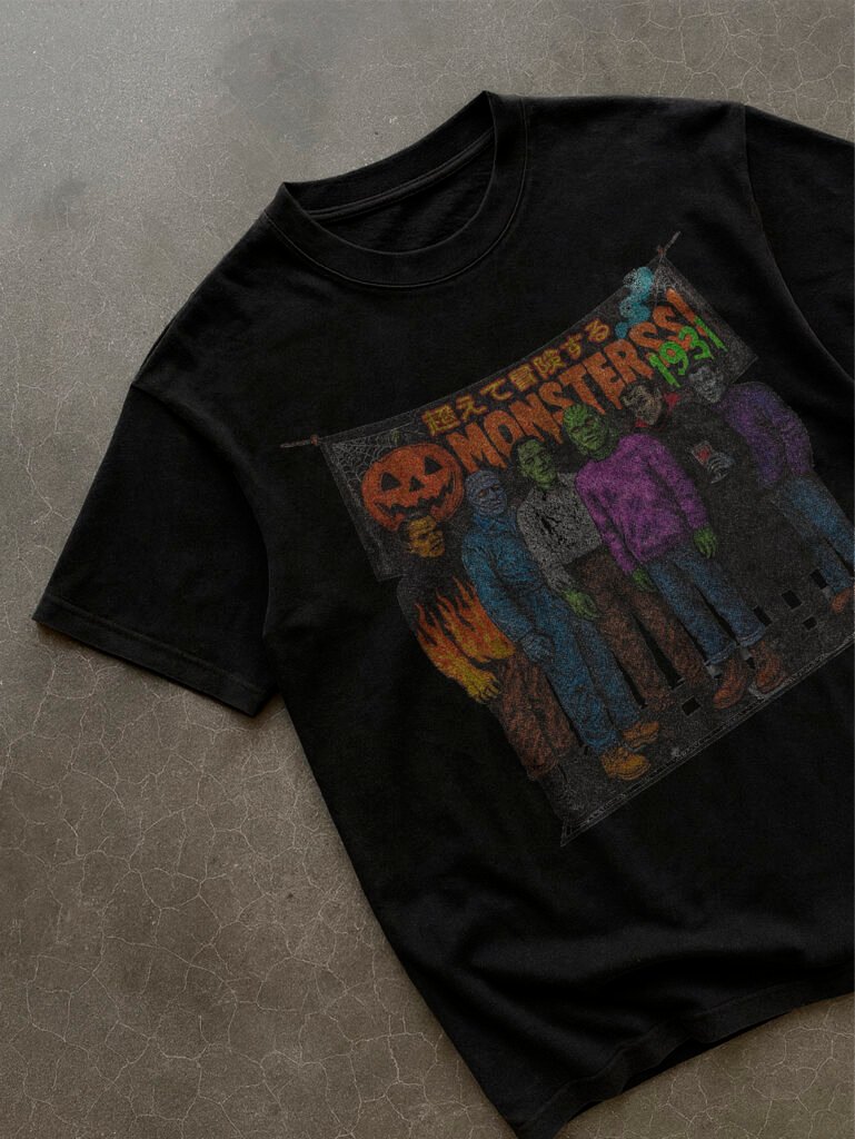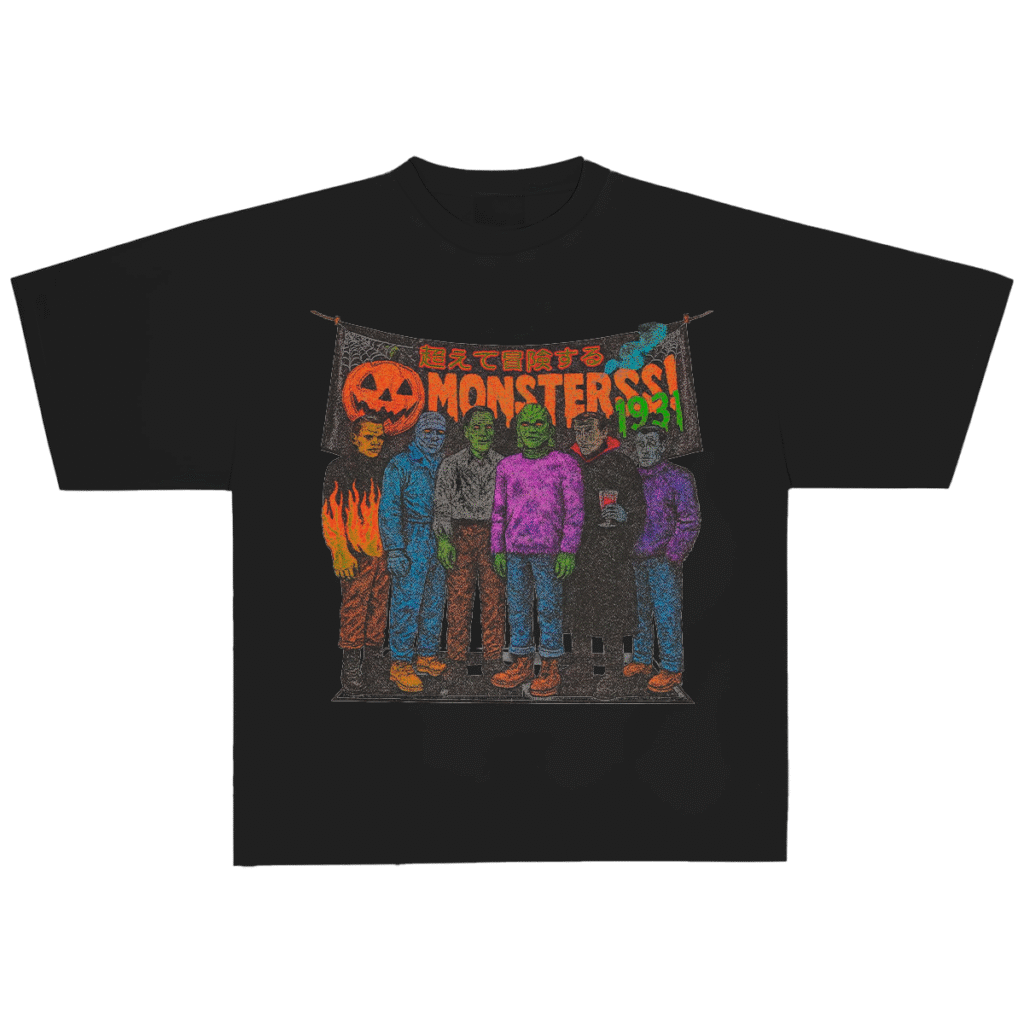 Un homenaje retro y vibrante a los monstruos clásicos del cine. Esta pieza revive el terror vintage con un estilo callejero y colorido. Frankenstein, Drácula y otros íconos se alinean bajo una lona ilustrada con detalles neón, llamas y caracteres japoneses que amplifican su estética ochentera.