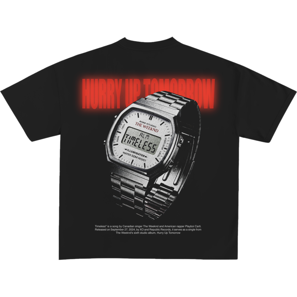 Camiseta de manga corta de algodón premium con corte personalizado y cuello acanalado. Destaca en la espalda por un gráfico hiperrealista de un reloj metálico clásico firmado por ANM Studio, coronado por el texto luminoso “HURRY UP TOMORROW” en rojo intenso y acompañado de una sutil tipografía descriptiva en la parte inferior. Frente de estética minimalista.