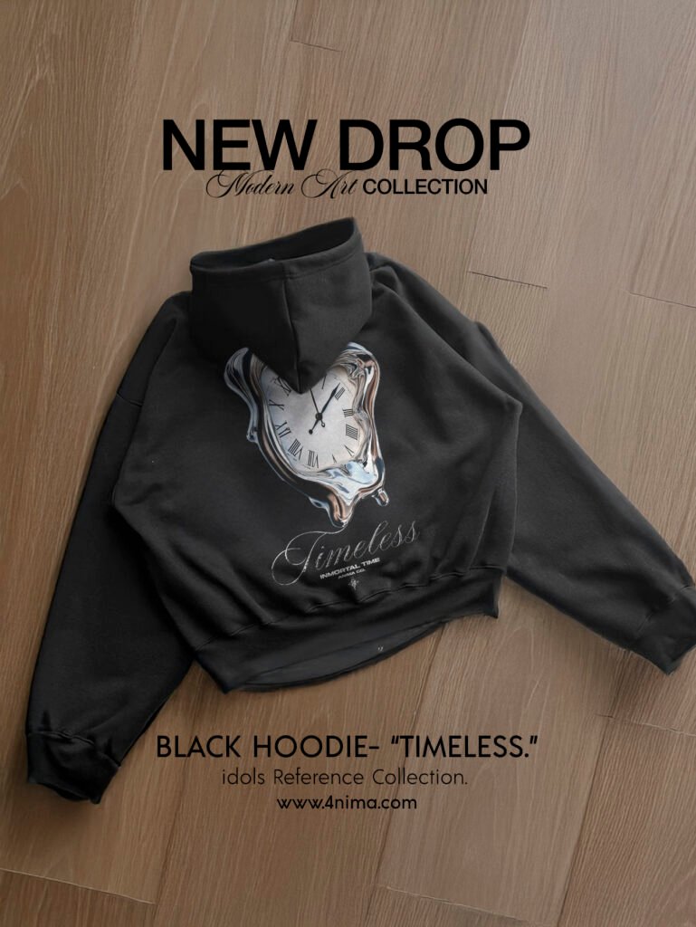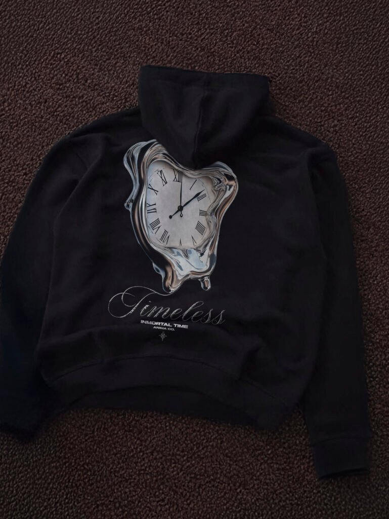 Gráfico trasero con reloj metálico derretido en estilo surrealista, acompañado del wordmark “Timeless”. Inspirada en la noción del tiempo inmortal y la fluidez de lo eterno. Tipografía elegante y acabados limpios al frente. Capucha de doble capa y puños acanalados.