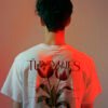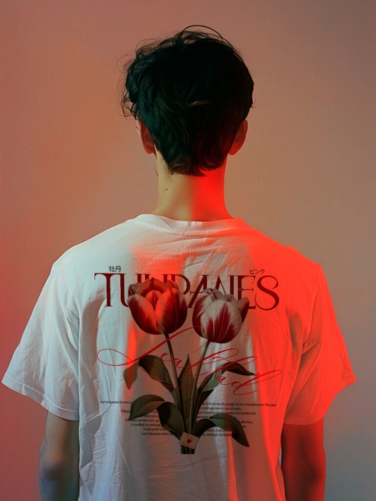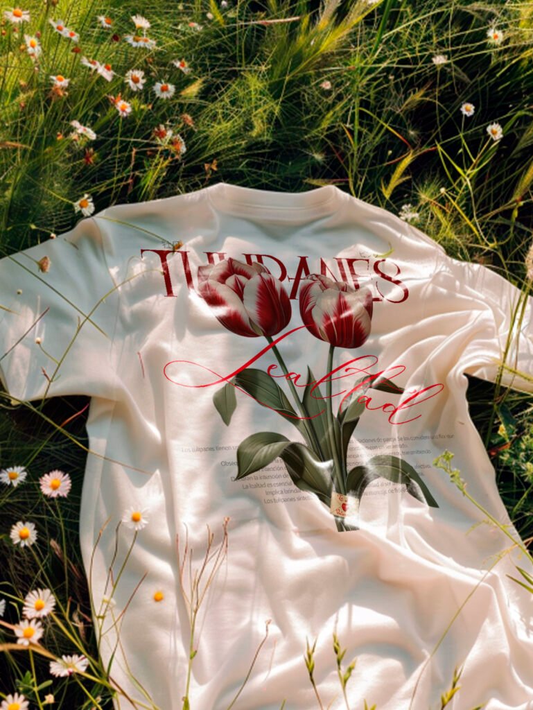 Estampado trasero con ilustración botánica de tulipanes en tonos rojos, acompañado de tipografía editorial y palabra “Lealtad” en caligrafía manuscrita. Texto conceptual que evoca el simbolismo de la flor como mensaje de fidelidad. Cuello acanalado y parte frontal minimalista.